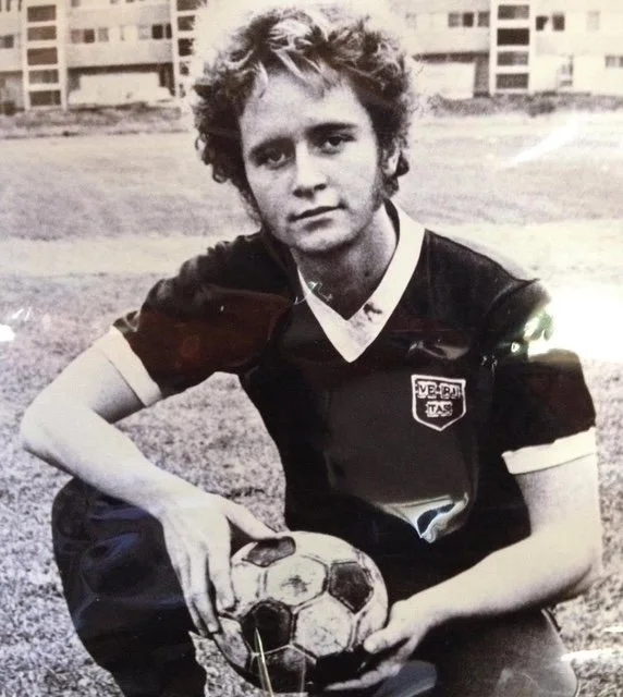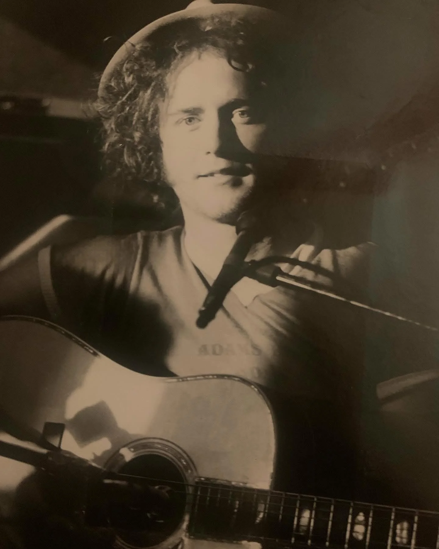 Wearing Adams House Raft Race merch, in a publicity shot for Sanders Theater gig, 1974.